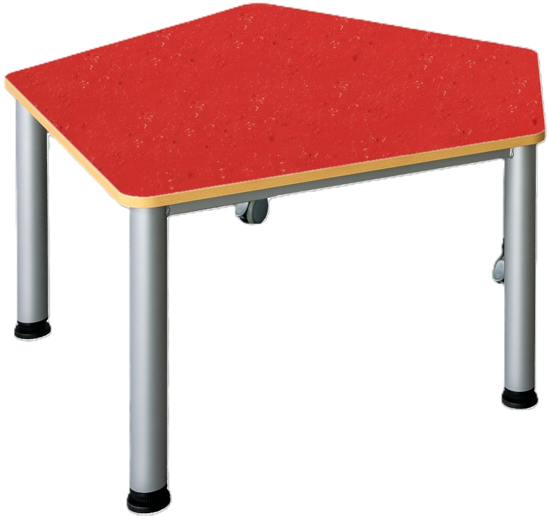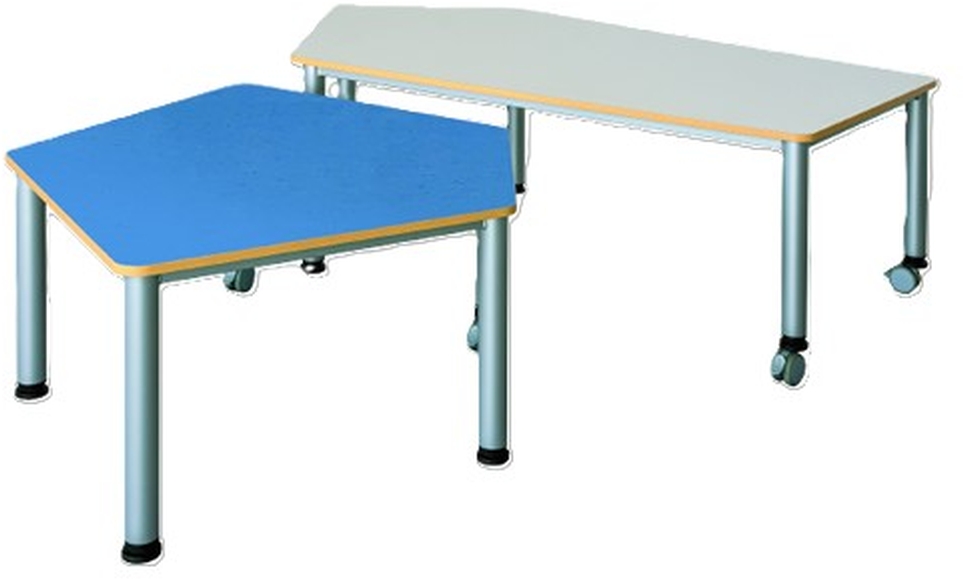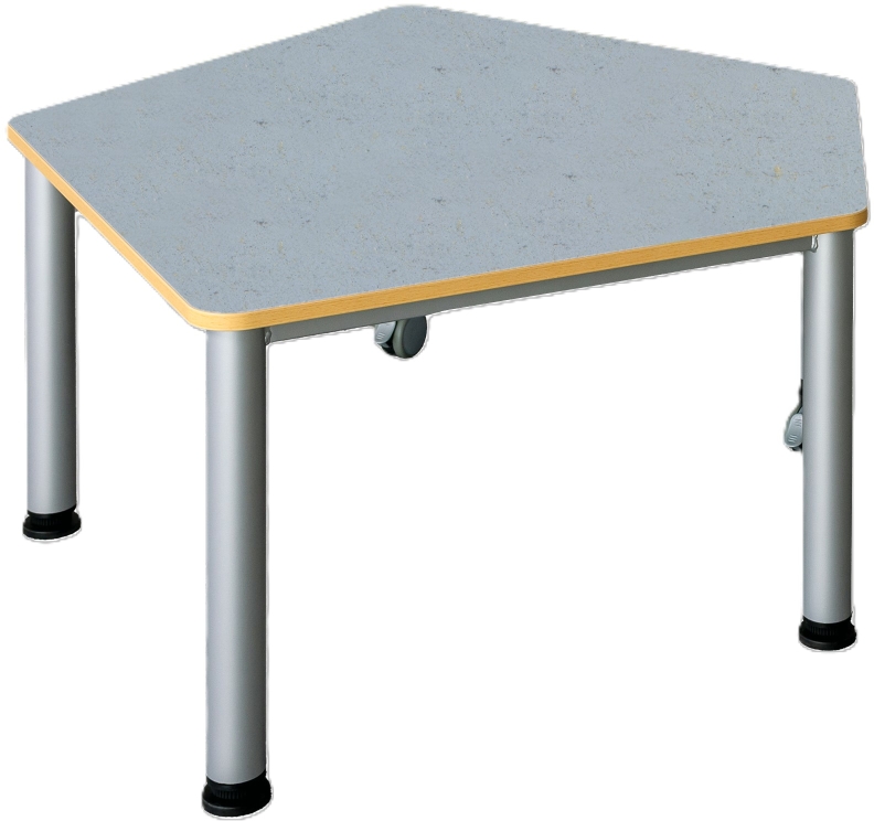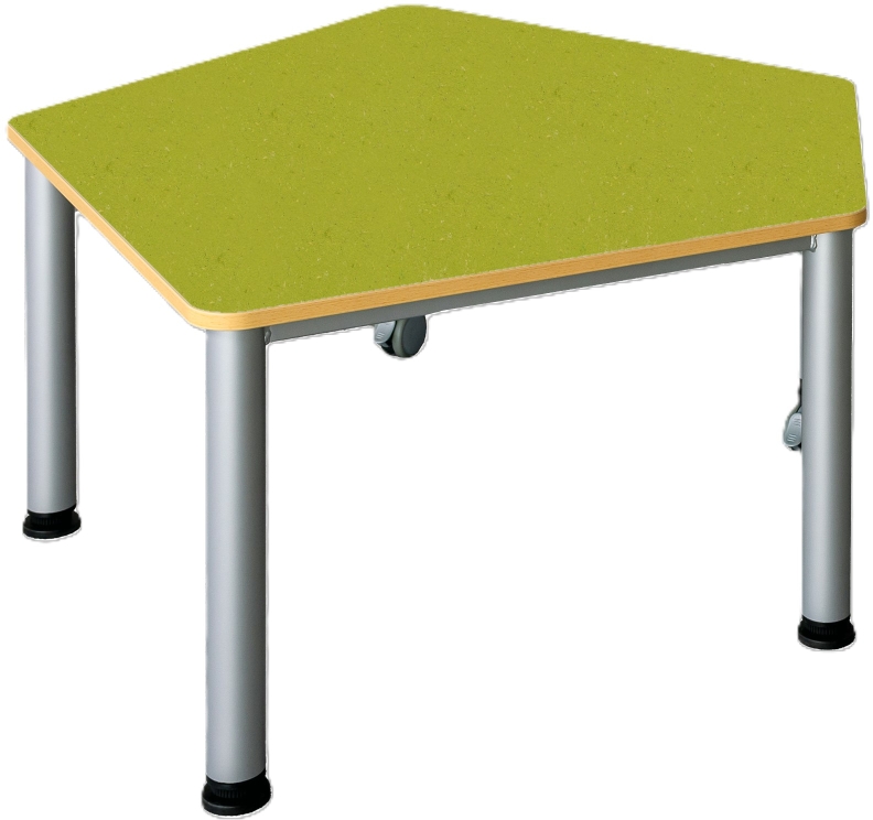 Fahrbarer Fünfecktisch mit Metallzargengestell und Rundrohrfüßen 6 cm, mit 2 Rollen. Die Tischplatte ist aus 19 mm E1-Spanplatte melaminharzbeschichtet. Mit 2 mm ABS-Sicherheitskante.